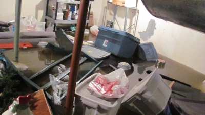 We finally went to bed as there was nothing we could do about the rising brown disgusting water. I made my home on the couch to listen to the bins splash in the water along with the shatters of mirrors, holiday decorations and glass nick nacks inside the bins.